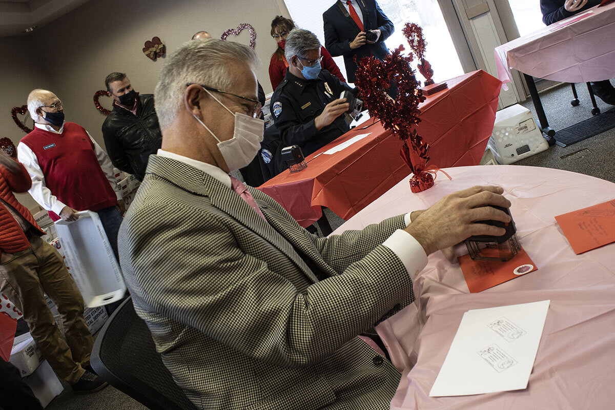Around 200 helpers were expected this year over multiple shifts across a couple of weeks. At the kickoff, volunteers in heart headbands sat at spaced-apart tables, each stamp sounding like a mechanical kiss. Meanwhile, a red-sweatered barbershop quartet crooned.