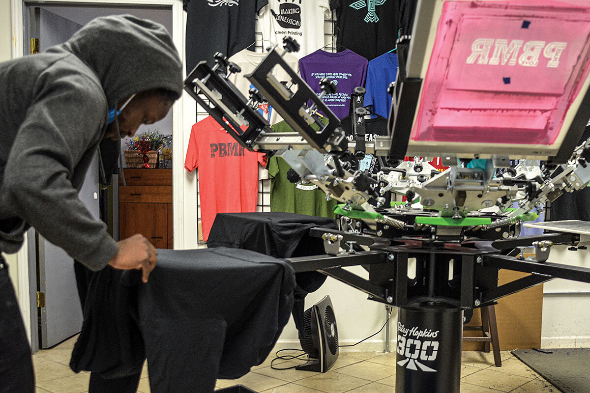 Upstairs, Shawn runs a six-armed machine that sits like a giant spider at one end of the room. It鈥檚 used to print customized T-shirts and sweatshirts, which Precious Blood sells to other nonprofits. Today he鈥檚 finishing a batch of hoodies for the Precious Blood staff, printing in white ink on black fabric the organization鈥檚 acronym 鈥 PBMR. Shawn is tall and lean, with long dreadlocks and a scruffy beard. He has plenty of street smarts, and a dry sense of humor that his co-workers enjoy. 鈥淵ou should be at Second City,鈥 one of them jokes, referring to Chicago鈥檚 famous improvisation theater. 鈥淚 know,鈥 Shawn says, grinning. 鈥淚 should.鈥澛