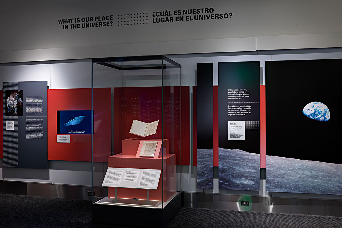 The exhibit proceeds both chronologically and thematically. Roughly chronological displays line the walls, starting with the 1700s and closing with the Apollo 8 message. In keeping with museum policy, all text is shown in both English and Spanish.聽聽聽 聽 聽