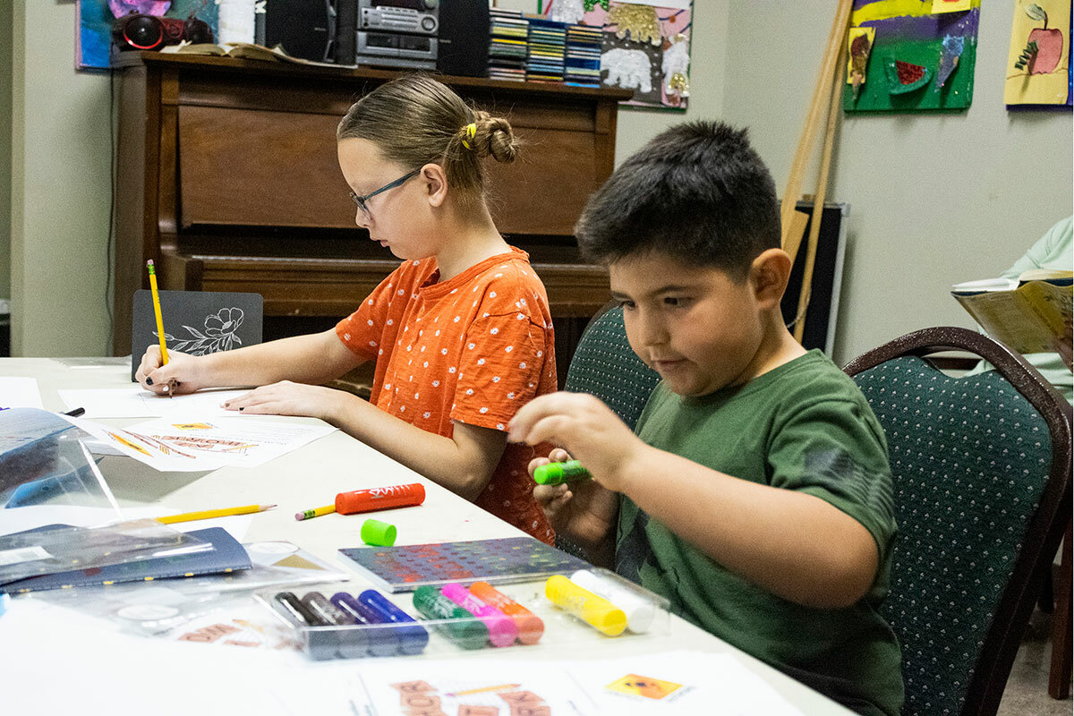 A disco ball spins rhinestones around a room at the back of the library. Meanwhile, over a rainbow array of art supplies, a couple dozen children are spinning with ideas.听