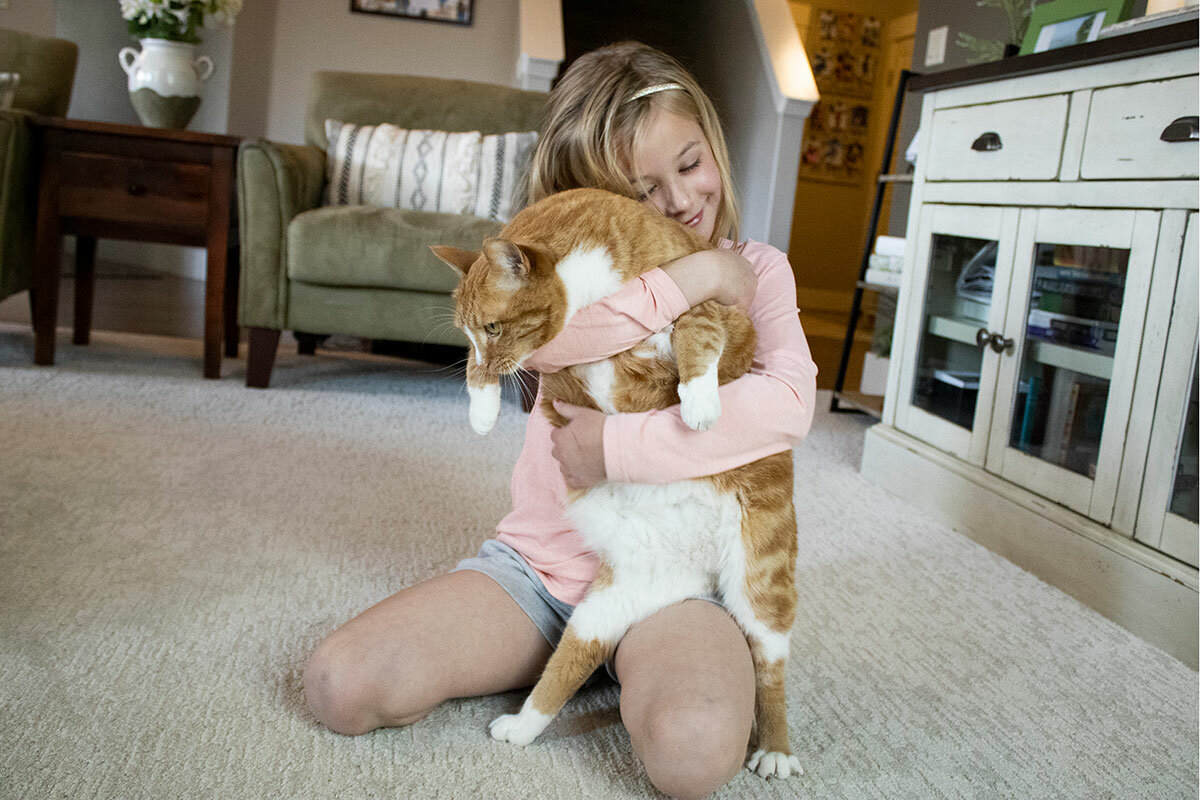 At home on Sunday, a plump orange cat named Louise lounges on the second grader鈥檚 leg.