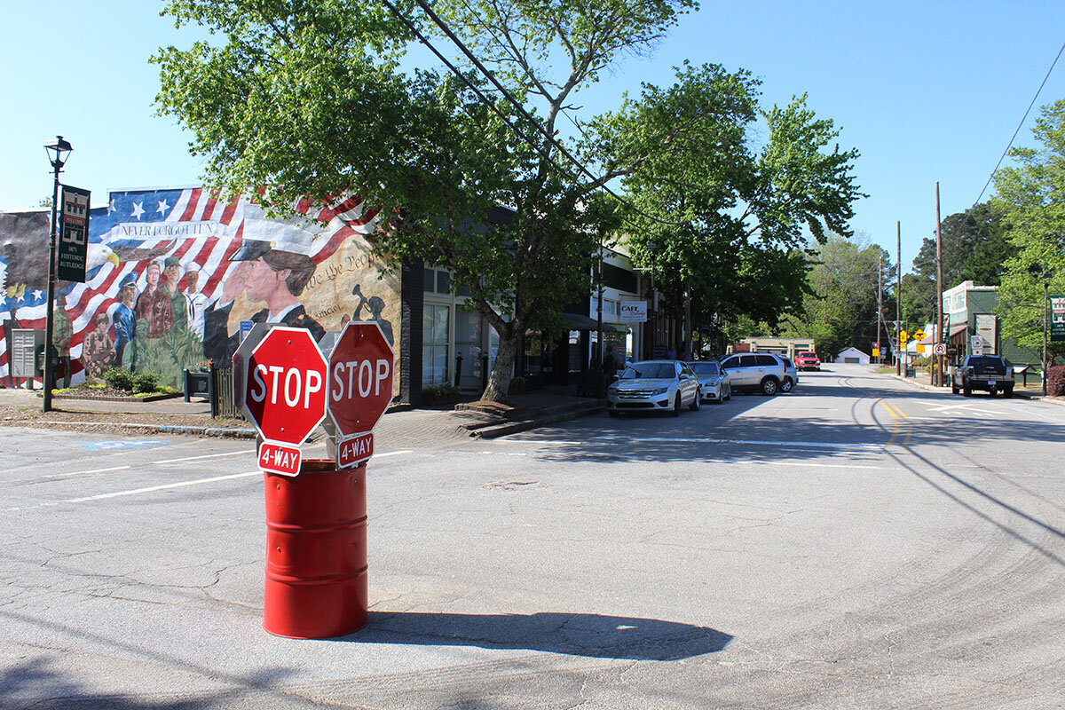 Downtown Rutledge is so small that instead of a stoplight, it has a traffic barrel festooned with stop signs. On a recent day, the traffic was so light that no one really noticed when a car accidentally backed into the barrel, setting one of the signs askew.