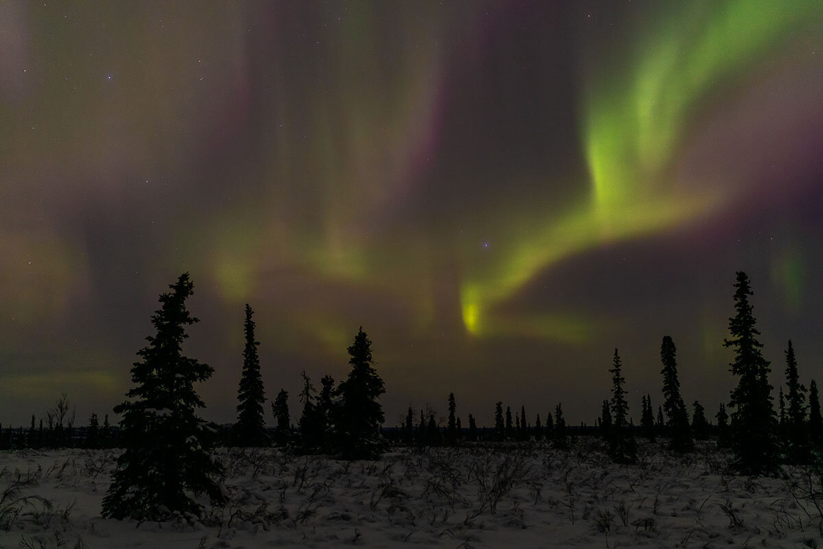 When we at last pull over at the designated spot, we are on the edge of a giant meadow. Only scattered evergreens stand between us and the horizon. No light pollution. No mountains to block the view. I am Scott鈥檚 only client tonight, but whether it鈥檚 one person or a bridal party from Japan, the professional photographer and videographer loves to come out here to witness one of nature鈥檚 most spectacular shows 鈥 and to share it with others.聽