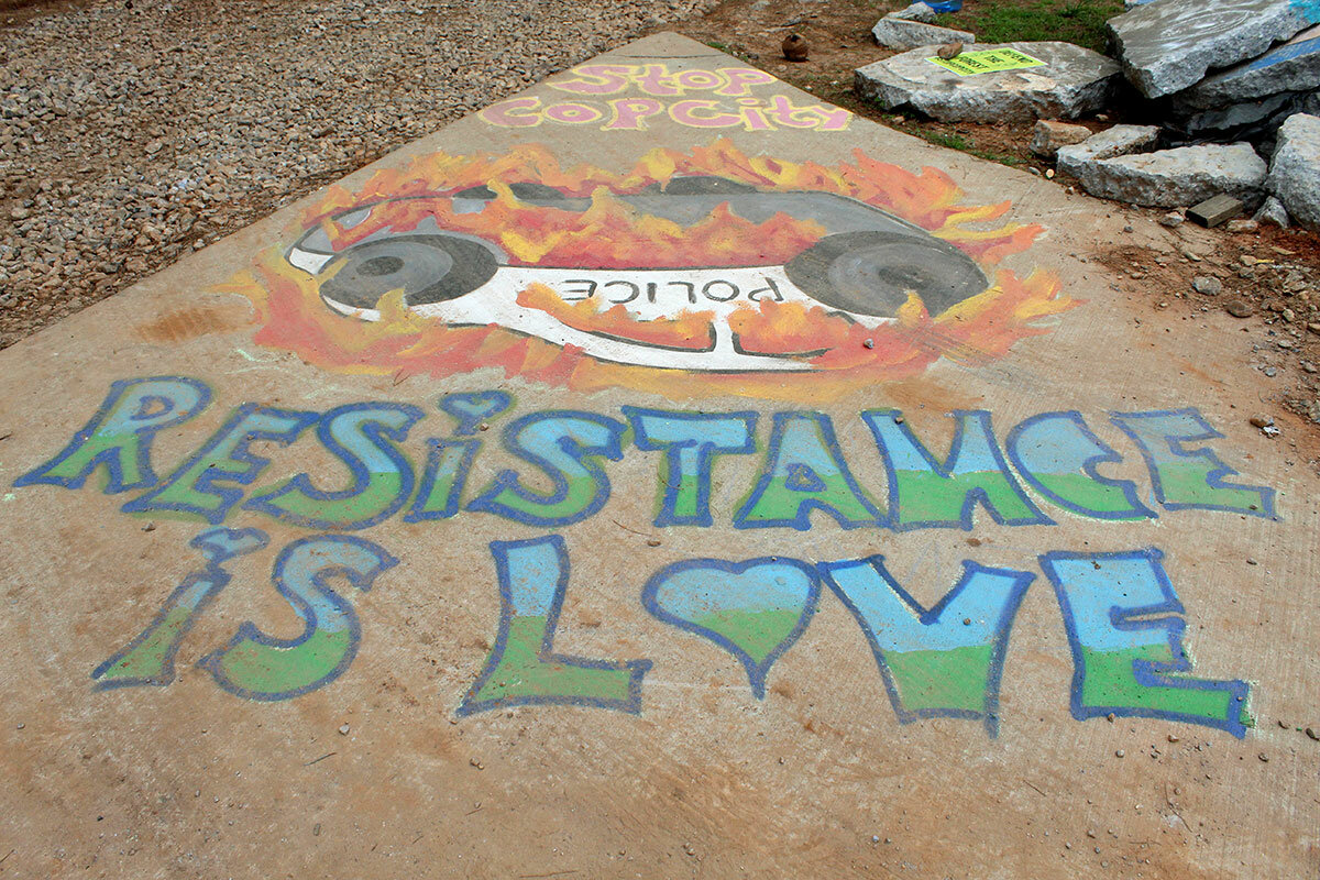 Amid the tangle of concrete and steel, there is a welcome tent with a young attendant. A drawing shows a burning police car, upside down, surrounded by the words “Resistance is love.”
