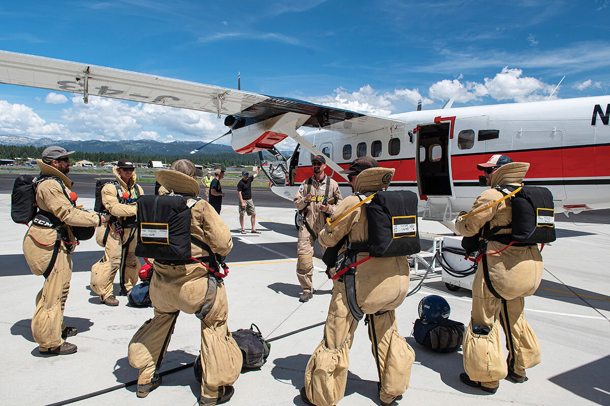 This morning, smokejumpers pile into two planes to practice their skills by jumping into the meadow below, where the landing spot is marked with a small flag. Each team has a spotter who determines the release point from the plane. Later, when the crews are back on the ground, the jumps will be rated for accuracy and, more importantly, soft landings. No fire jumper wants to be injured on the drop into a conflagration.聽