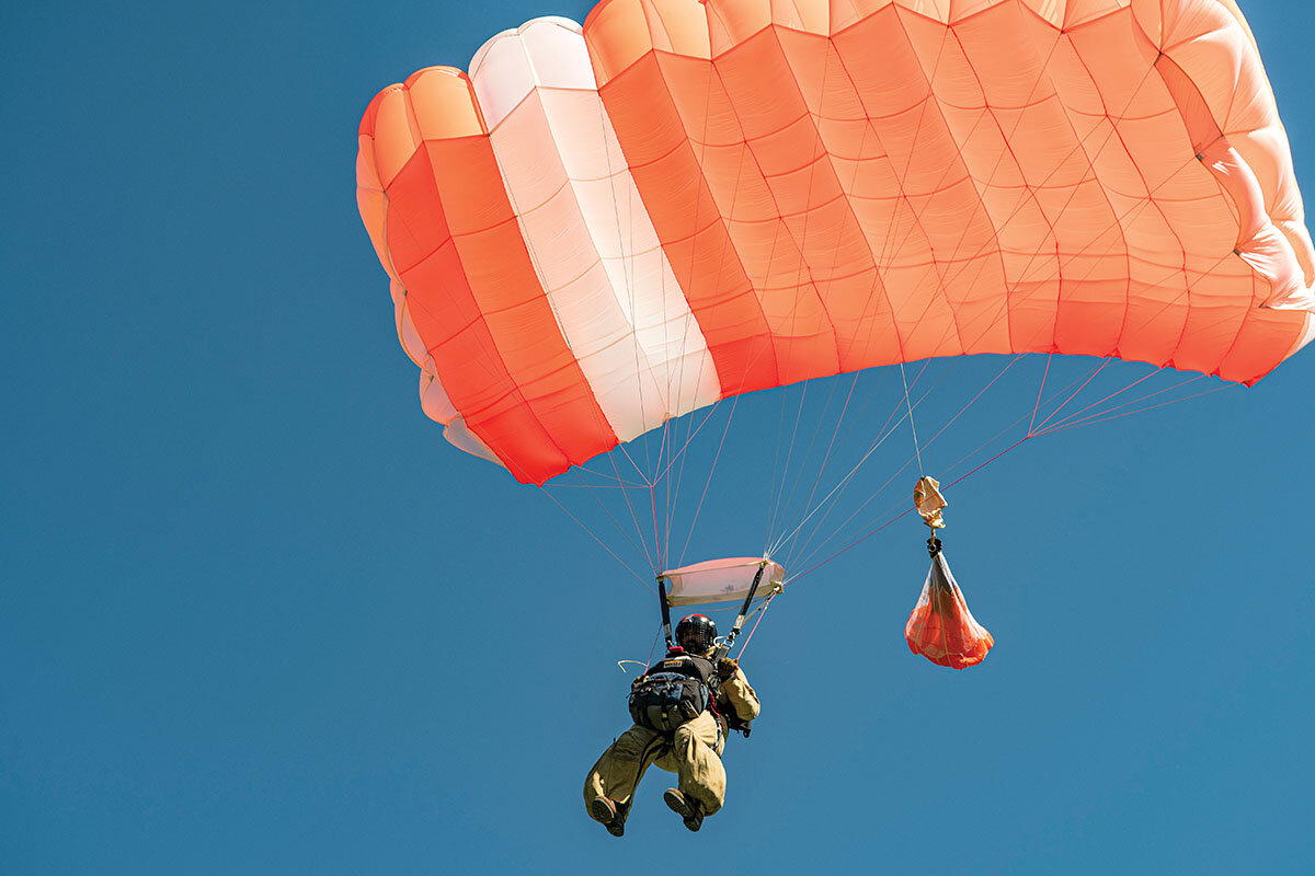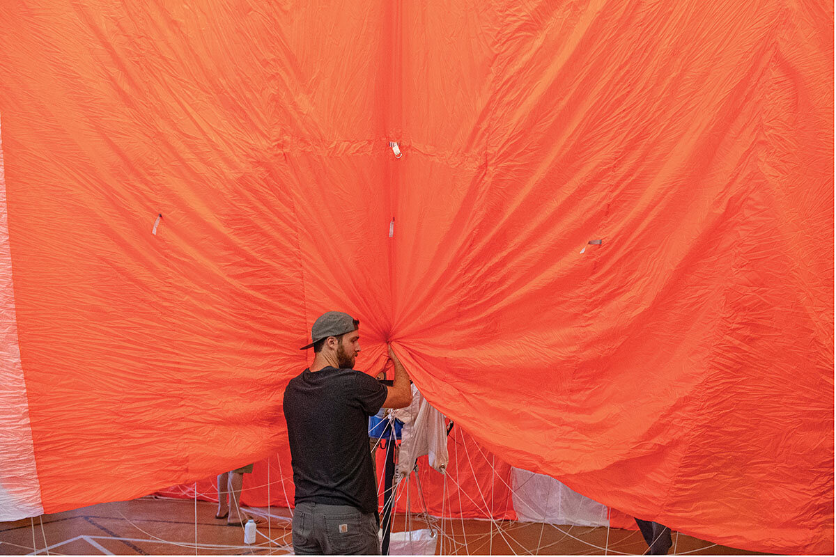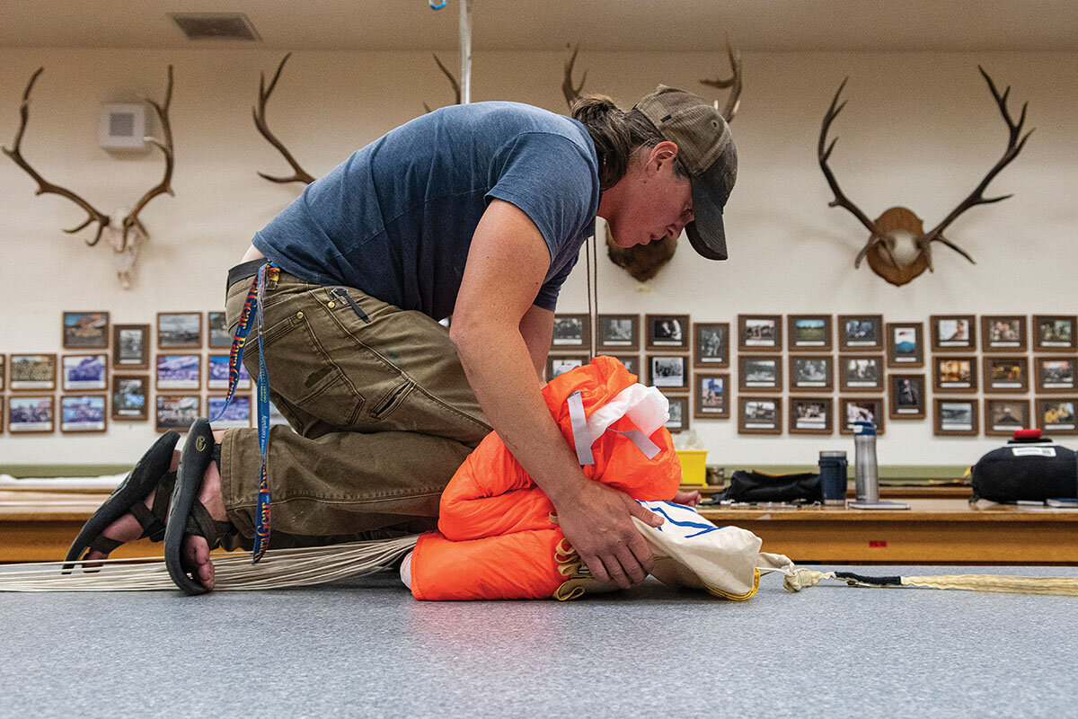 Back at the base, there is no idle moment. All the parachutes that have been deployed must be meticulously inspected for rips and defects, and every single line must be checked individually. From this point, the chute goes either to the repair shop or to be rigged. The art of rigging, which demands full-body action and intricate folding, is a combination of sumo wrestling and origami-making. This goes on for hours.