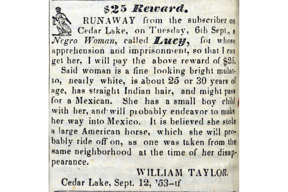 One from 1861 offers a 鈥渓iberal reward鈥 for two rifle-armed men presumed fleeing to Mexico. An escaped woman named Lucy for having 鈥渟traight Indian hair, and might pass for a Mexican鈥 in 1853. A capture notice of a 鈥渘egro鈥 man called Dan in 1865 published two months after the Confederate surrender 鈥 and three days before Juneteenth.聽