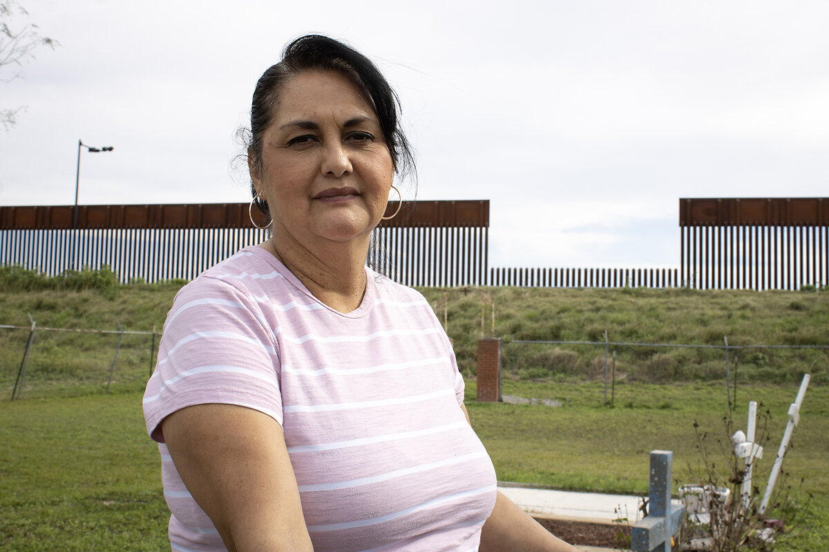 Back at the Webber Cemetery, beneath the border wall, Ms. Bravo tidies flowers that tipped over in the wind. Some days she comes to mow.