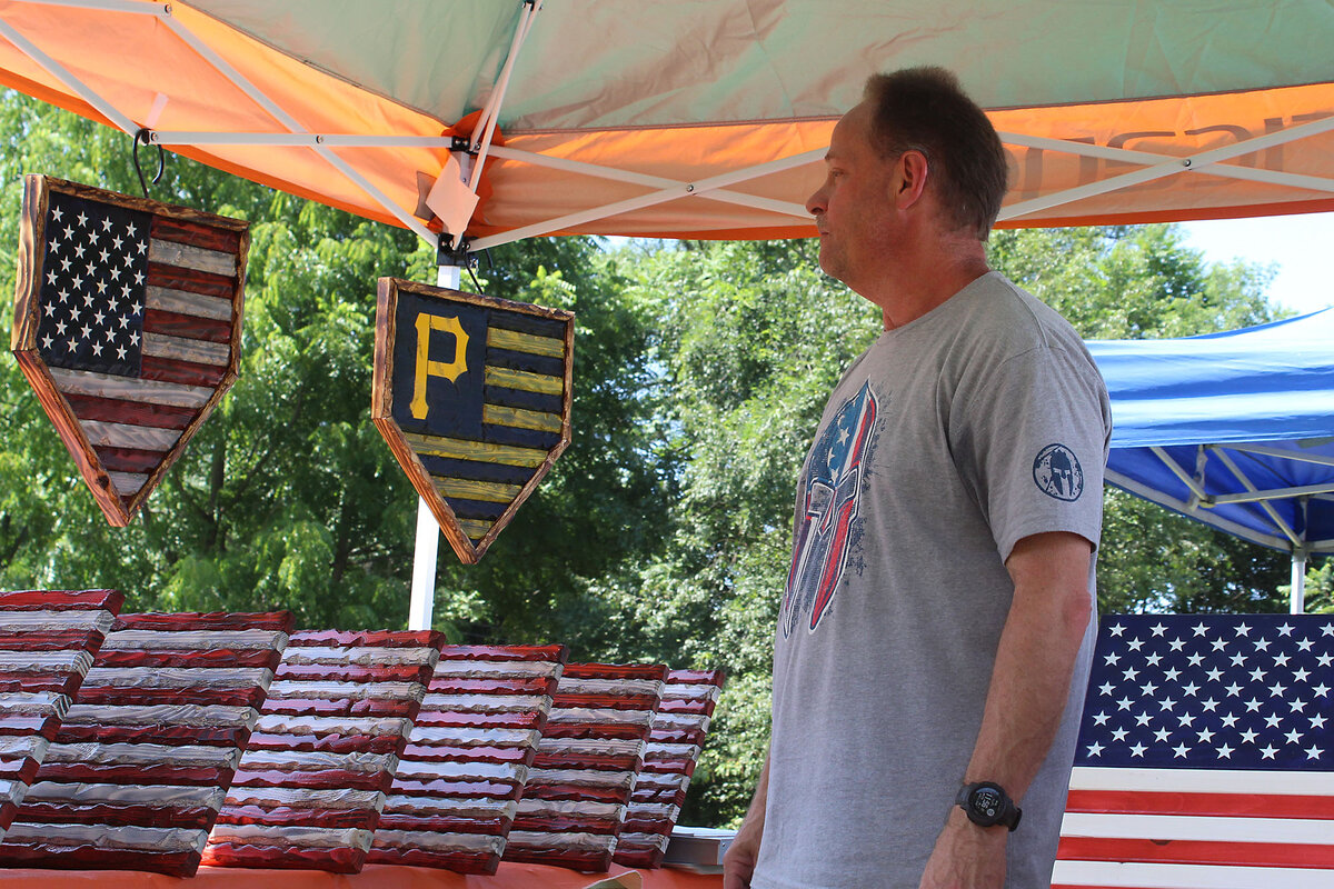Scott Curcio, an engineer, is staying cool under a tent at the second annual Family and Freedom Festival in adjacent Evans City. Also a woodworker, he sells wooden American flags of his own design and manufacture.