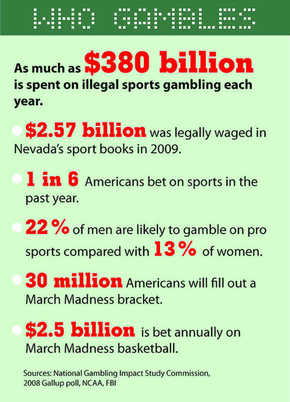 The impact of March Madness can be more nefarious than just idle workers. The FBI estimates $2.5 billion is bet annually on the month-long tournament. Experts believe even simple wagers can lead to more dangerous forms of betting. "You always start somewhere, and for sports gamblers, it's NCAA brackets or Super Bowl squares," says Timothy Otteman, a sports gambling expert at Central Michigan University in Mount Pleasant.