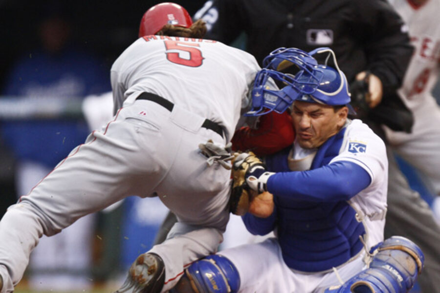 Oakland Athletics' Matt Carson, left, and Mark Ellis, right, are greeted at the dugout after they scored against the Arizona Diamondbacks during the sixth inning of their spring training baseball game at Salt River Fields at Talking Stick near Scottsdale, Ariz., Thursday, March 24.