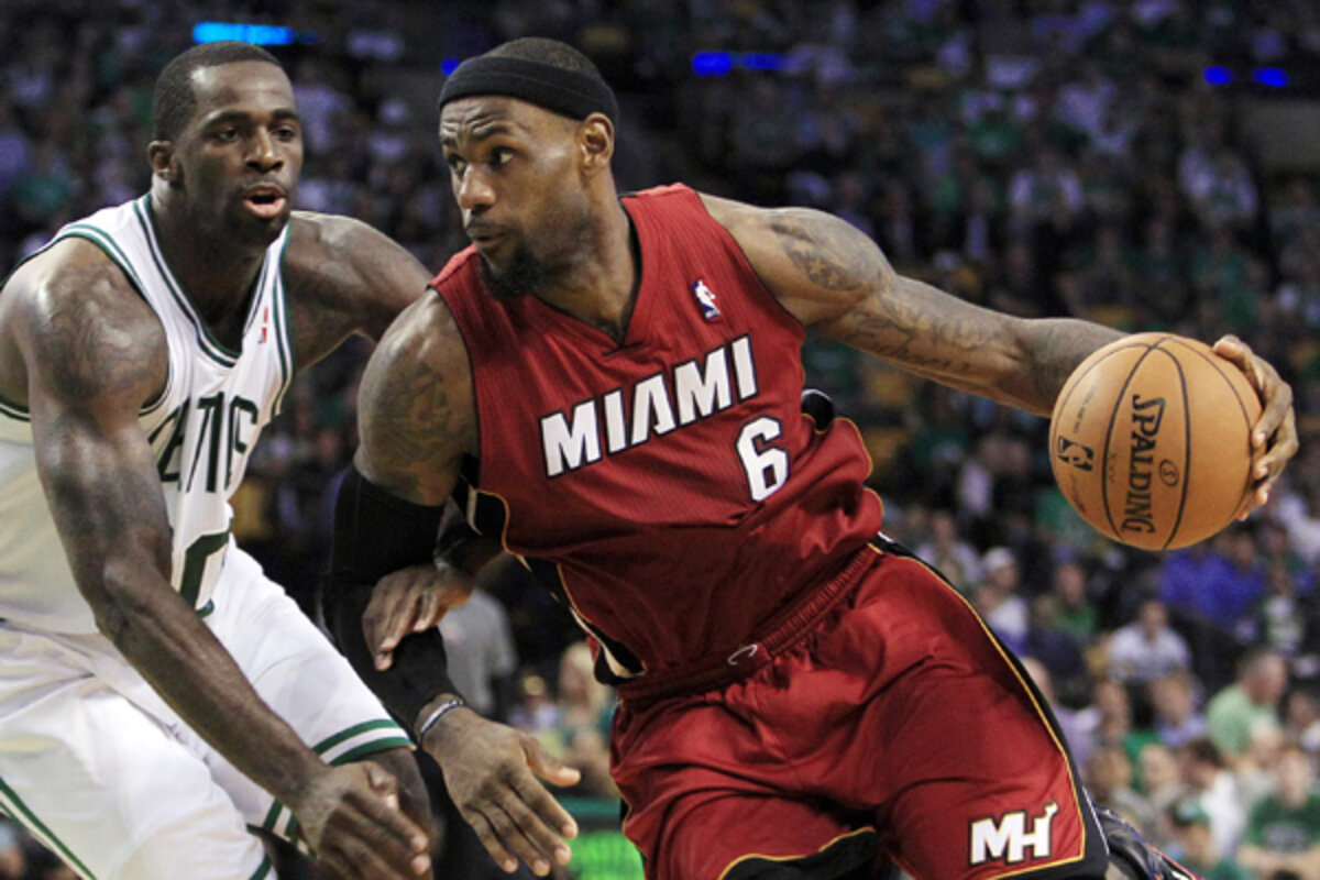 The Celtics also lost the battle of the boards to the Heat, 44-34, where once again, James led both squads with 15 off the glass. Dwyane Wade, though he had a highly respectable 17 points (including three of four 3-point attempts), eight rebounds and three steals, was merely a bit player compared to leading-man James, who like Charles Atlas, carried the Heat on his shoulders in becoming only the second player ever (the legendary Wilt Chamberlain being the other) to notch 45 points and 15 rebounds in a playoff game. And in hitting 12 of his first 14 shots, James put on a clinic of athleticism 鈥 striking virtually at will from a variety of locations 鈥 and bodily contortions 鈥 with degrees of difficulty that would confound an Olympic gymnast.