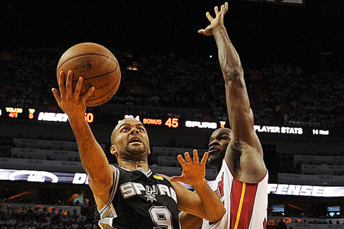 Parker鈥檚 high-arcing shot off the glass was checked by officials to make sure that he beat the 24-second shot clock, which expired just after the ball left Parker鈥檚 hands. San Antonio, which had trailed for most of the game, got 10 points from Parker in the fourth quarter 鈥 only six fewer than the entire Heat team scored in the same period. Parker led all scorers with 21 points (along with 6 assists), followed closely behind by teammate Tim Duncan, who had 20 points and 14 rebounds.