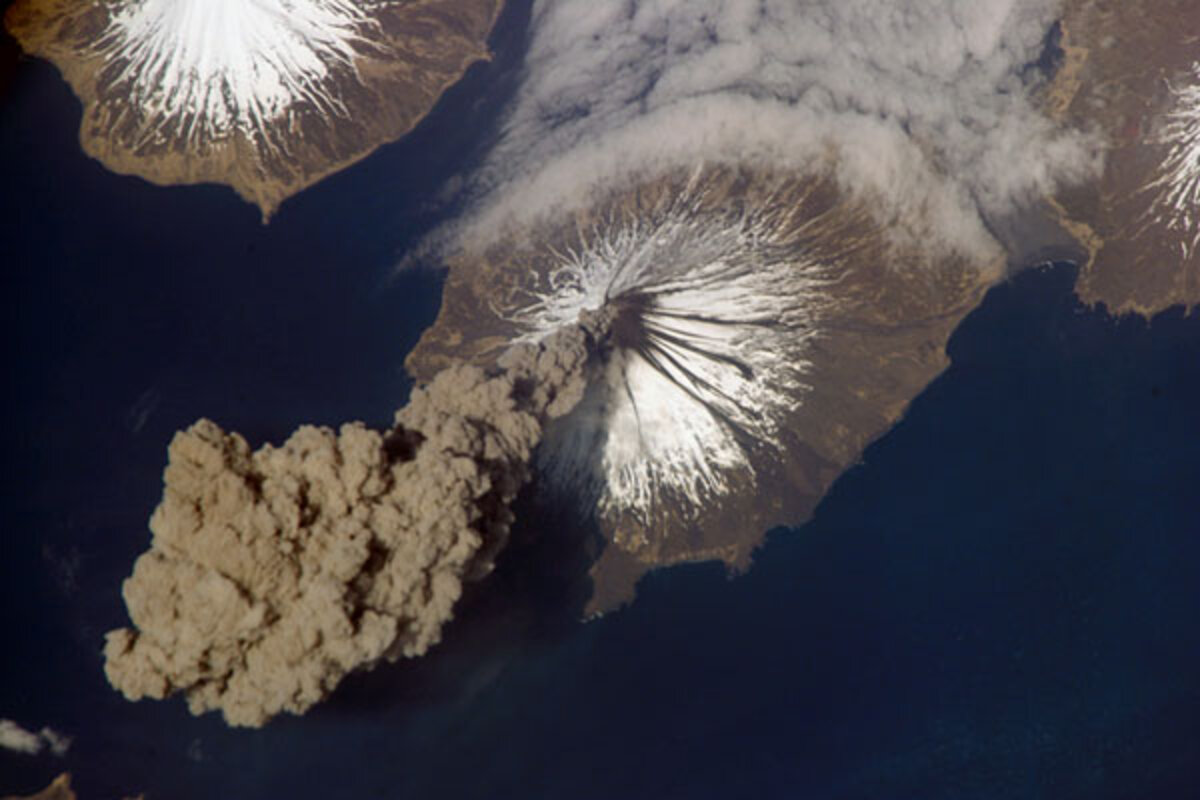 The Aleutians are a bleak and forbidding island chain extending southwest from the Alaskan mainland toward Russia. Cleveland is located on uninhabited Chuginadak Island. The nearest settlement, on an island about 45 miles away, is Nikolski, population 18.