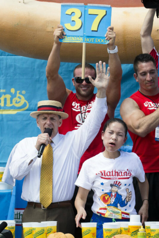 Thomas won $5,000 for the women鈥檚 competition and defended her titles from 2012 and '11. Last year, she set the women鈥檚 record by gobbling聽45 hot dogs.