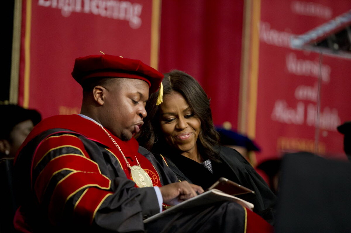 at Tuskegee University鈥檚 graduation ceremony Saturday in which she discussed the school's importance in African American history and how to overcome challenges, including racism, in America today.聽