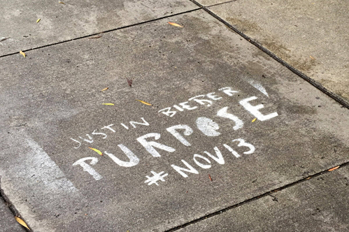 The stenciled prints mostly say, "Justin Bieber Purpose #Nov. 13" in a white, scrawled font, and at least eight photos of the ads were sent as evidence along with the letter to the record label. The paint seems to be permanent.