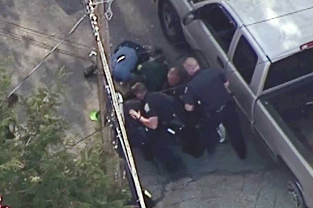 Law enforcement officers then converged on him, at which point video captured by a WHDH news helicopter while he was on the ground, before taking him away in custody.