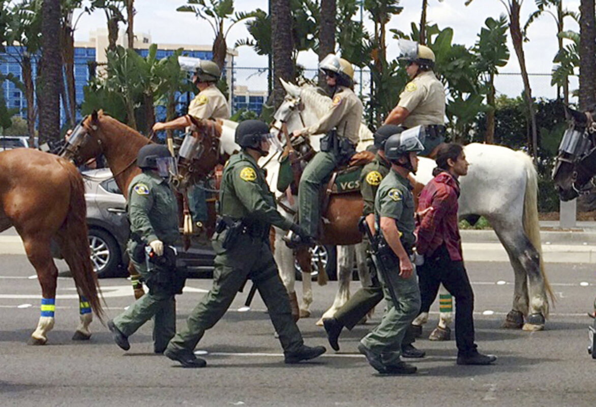 Police聽had warned they would take "swift" action if protests at the event in Anaheim escalated. About 100聽police聽officers stood watch behind metal barricades and another 50 sheriff's deputies lined up along the convention center.