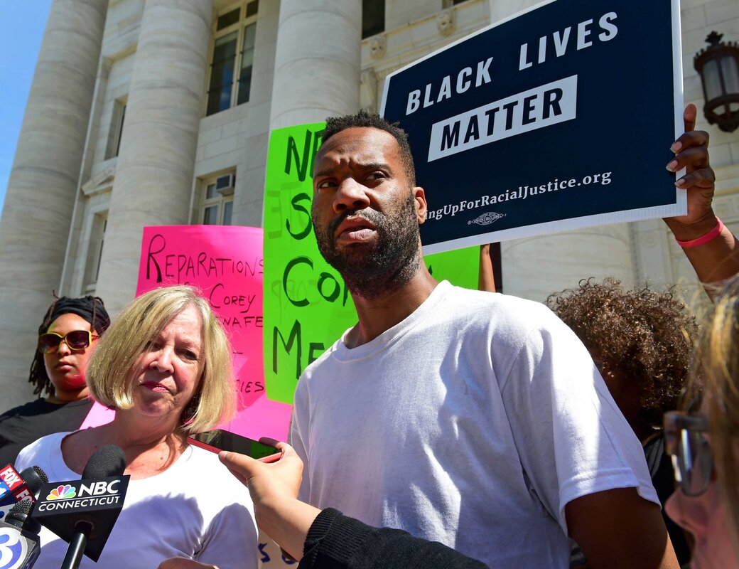 Menafee, 38, appeared in court Tuesday charged with felony criminal mischief and misdemeanor reckless endangerment. He did not enter a plea. Afterward, he told reporters outside New Haven Superior Court that he was upset over the聽image聽in the window.