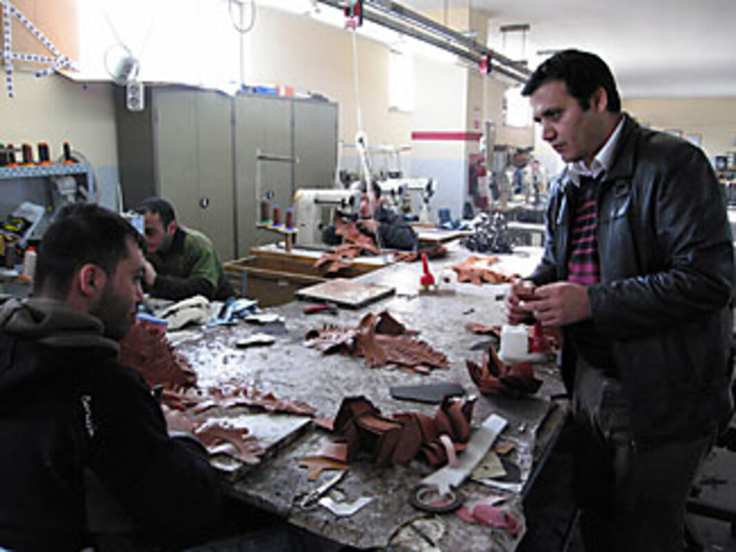 Down in the Baydan shoe company's workshop, about a dozen men are feverishly churning out pairs of model 271 in light brown leather for an order heading to Iraq.