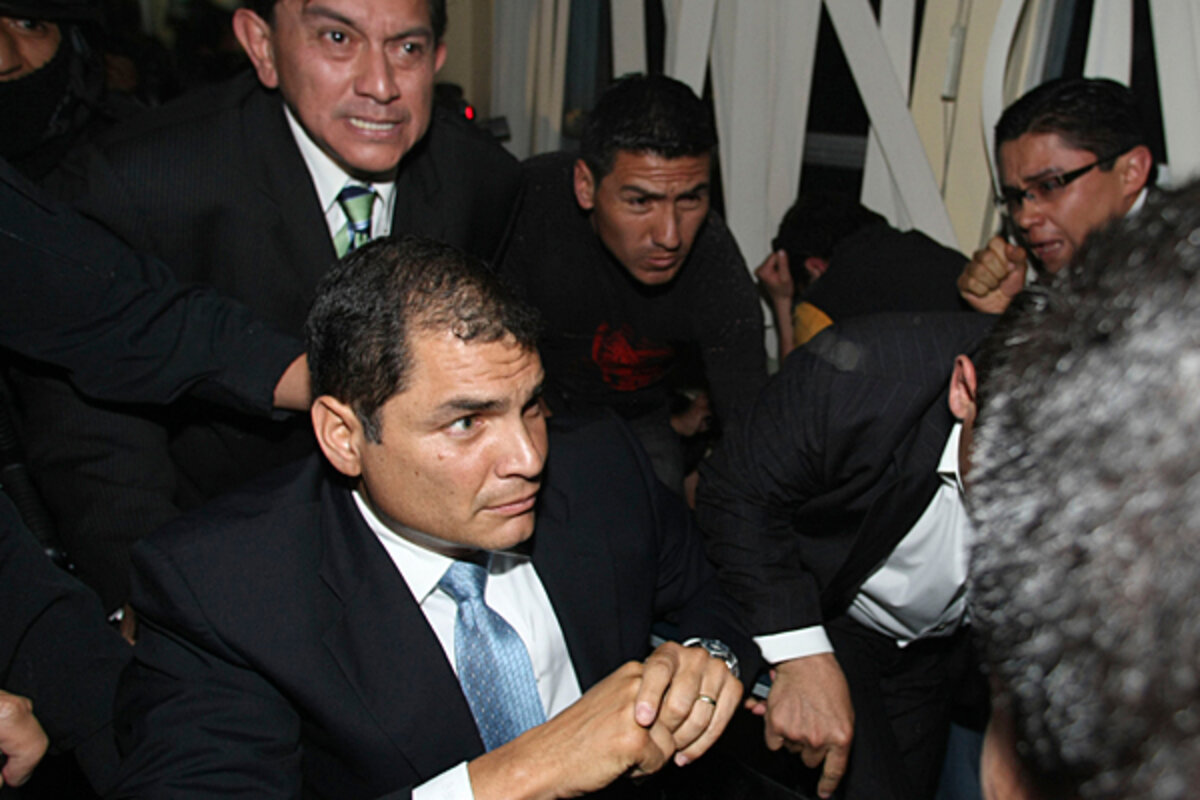 President Correa, who was roughed up and injured by tear gas when he attempted to seek dialogue with disgruntled officers Thursday, was trapped in a hospital as angry protesters surrounded the building.