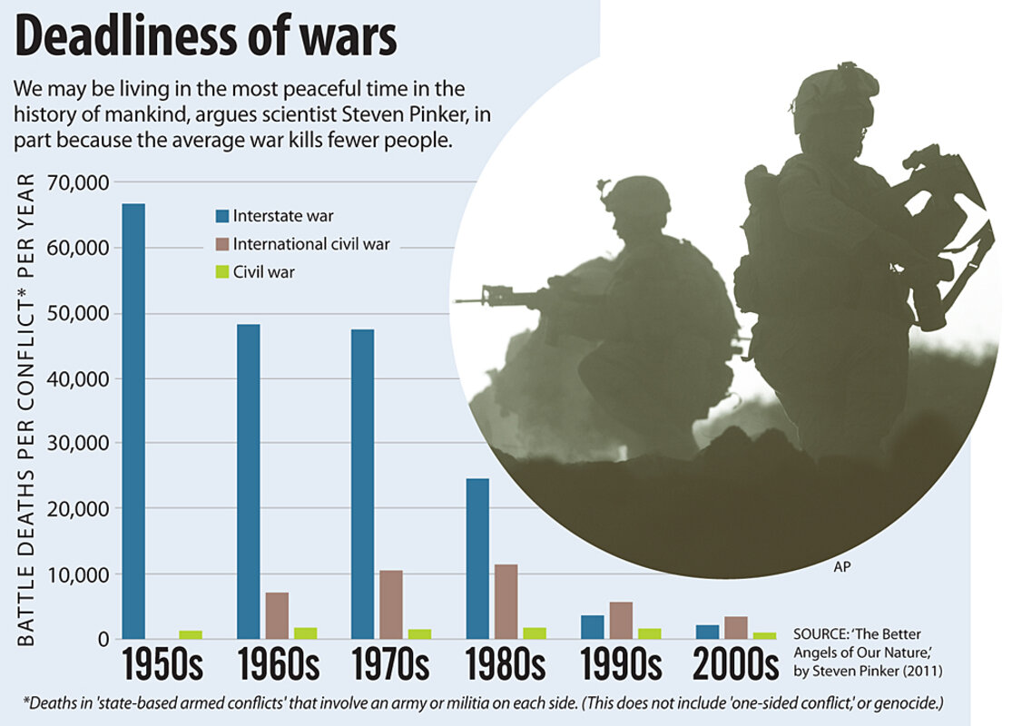 Perhaps more important, war casualties have plunged, according to Pinker. A bar chart of the number of people killed in conflicts per decade shows steady downward progress since the 1950s.