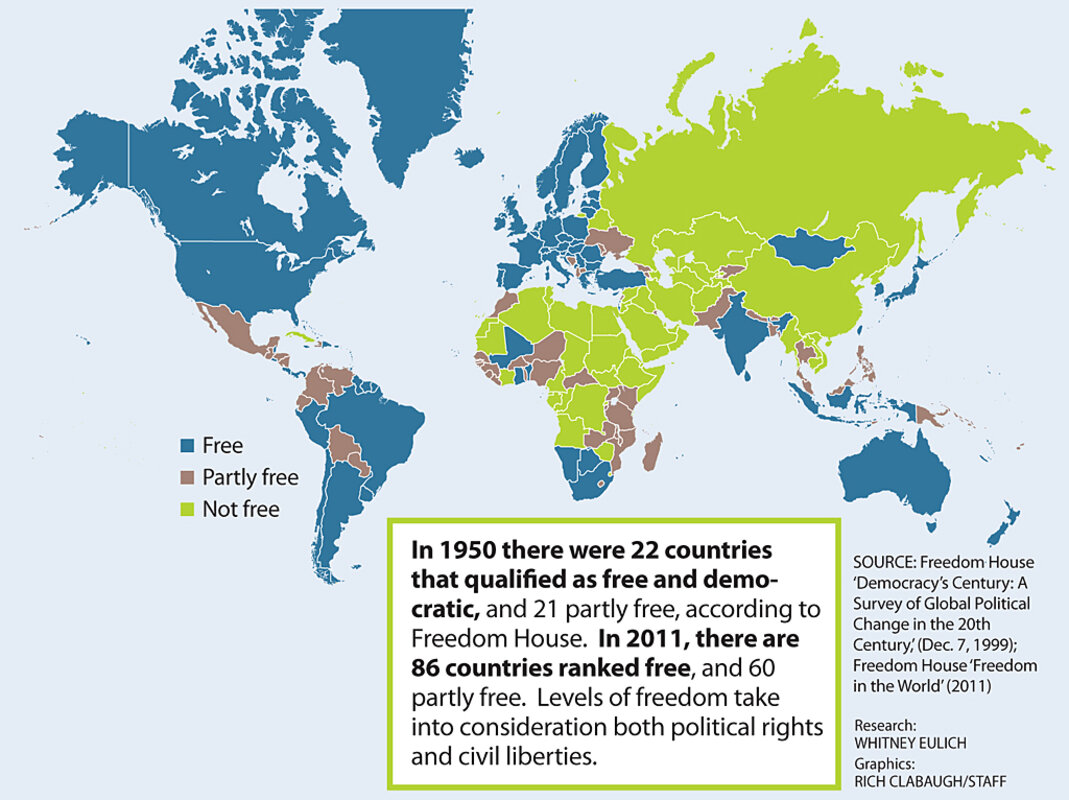 Since then, there has been some backsliding. Today, democracies account for 115 of the world's 194 nations, or 59 percent, according to Freedom House's annual report "Freedom in the World."