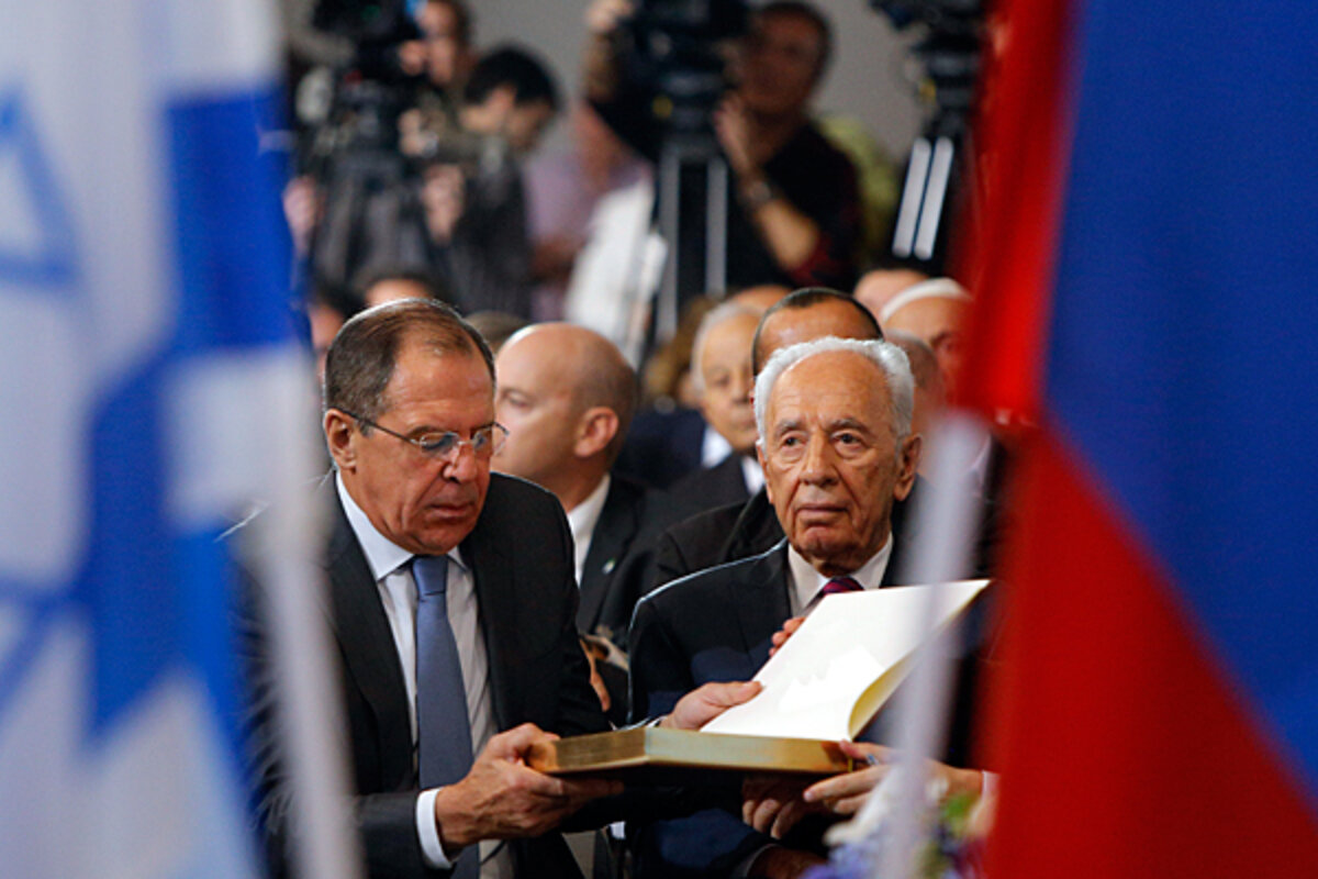 "At this emotional moment I can see generations of my people before my very eyes and I carry them with me," Mr. Peres said. "My parents were born in Russia. In my home we spoke Yiddish, Hebrew, and Russian....