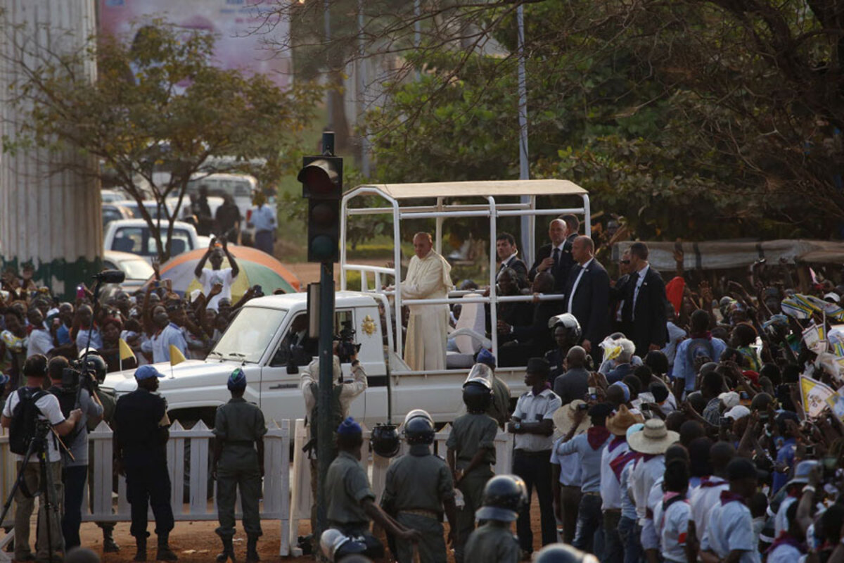 Flanked by Vatican bodyguards in flak vests and machine-gun-toting U.N. peacekeepers,聽Pope聽Francis plunged Sunday into conflict-wracked Central African Republic to bring a message of peace and reconciliation to a country where 海角大神-Muslim violence has divided the capital and forced nearly 1 million people to flee their homes.