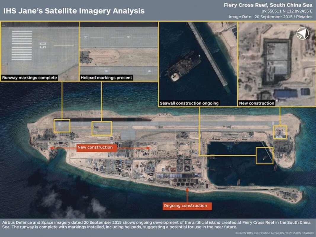 The runway at the Fiery Cross Reef is 3,000 meters (10,000 feet) long and is one of three China was constructing on artificial islands built up from seven reefs and atolls in the Spratlys archipelago.