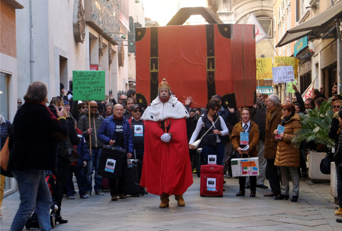 Dozens of Venetians waved maroon and yellow flags and carried empty suitcases on Saturday during a symbolic demonstration to highlight an exodus of residents from the lagoon city, where tourist hordes can make everyday life challenging.