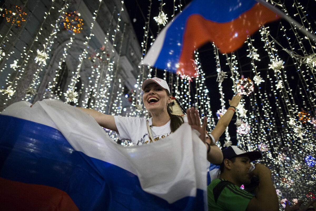 A Moscow subway security guard gives a visitor a thumbs-up sign. A waitress in Saransk bubbles over in wonder at meeting her first-ever American. Buoyant Russian fans sing, party, and share face paint with foreigners.