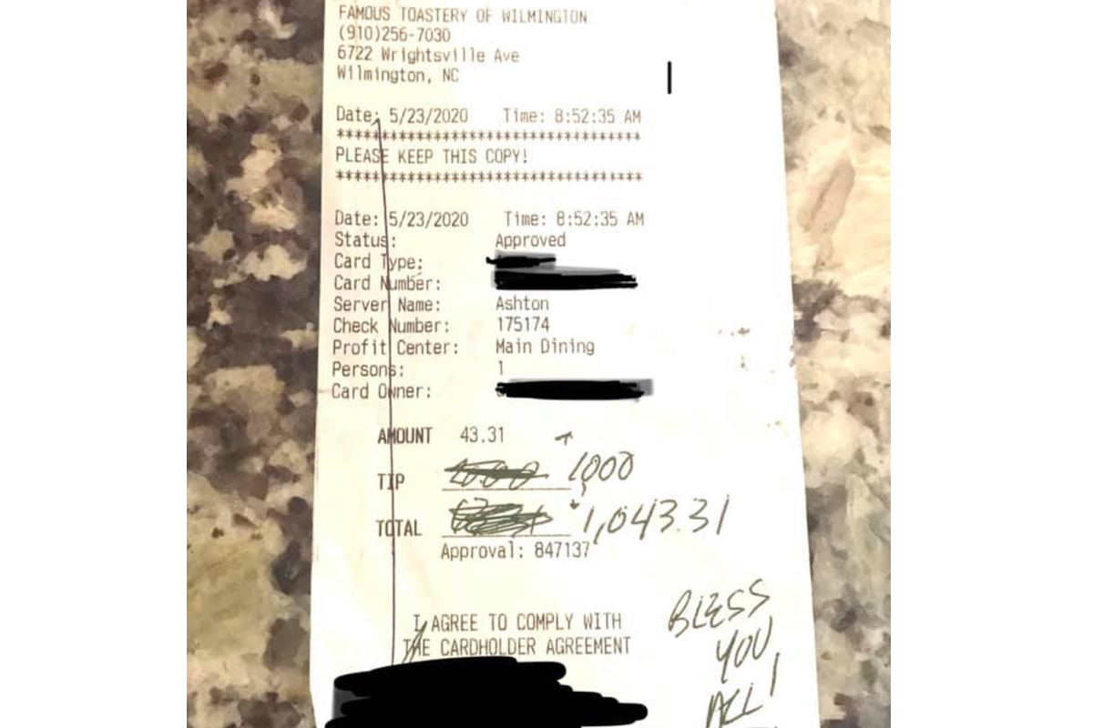 That kind of generosity means a lot to those struggling in the restaurant industry. Here鈥檚 another $1,000 tip left with a twist.听 On May 23, a couple left a big anonymous "thank you" for a meal at Famous Toastery in Wilmington, North Carolina. What happened next took it to another level. The - the front and back (kitchen) staff, according to the restaurant鈥檚 Facebook post.听