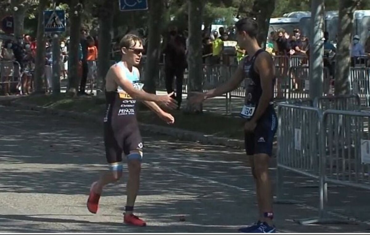 In the closing moments of the Santander Triathlon in Barcelona on Sept. 13, British competitor James Teagle took a wrong turn. Running behind him, Mr. M茅ntrida passed Mr. Teagle and was now in third place in the race. But as he realized what Mr. Teagle had done, he stopped to let him catch up and cross the finish line first. Mr. Teagle finished third in the race, and in gratitude, .听