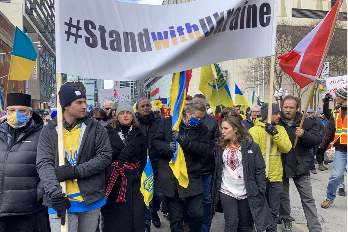 At the end of the liturgy St. Volodymyr Ukrainian Orthodox Cathedral, Mr. Buciora tells the congregants about a march in Toronto that afternoon. It attracted thousands, including Toronto Mayor John Tory and Canadian Deputy Prime Minister Chrystia Freeland, who walked at the front of the protest alongside Ukrainian priests, as a steady mass behind waved Ukrainian flags and anti-Putin signs and chanted 鈥淪tand with Ukraine.鈥