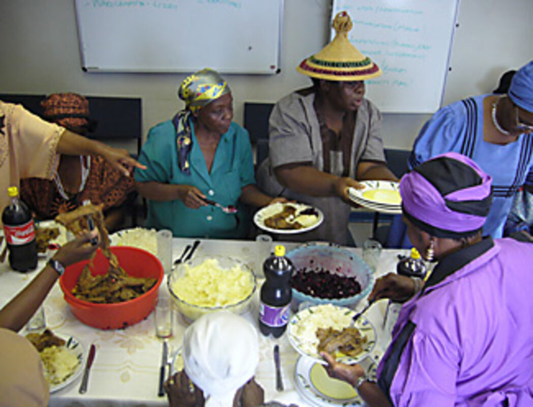 At 3 p.m. Moloi, in her best party dress, rushes in 鈥 Friends for Life staff hauling in pots of food and panting behind her. Soon, everyone is seated around a long table, piling massive quantities of rice, fried chicken, beets, and cabbage smothered with mayo onto one another's plates. There is sudden silence as the women tuck in, washing it all down with grape Fanta.