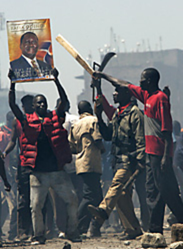 The streets of Kibera have become an obstacle course of charred cars and minivans. Prices for milk and bread have doubled, and cooking fuel is simply not to be found. "The food sold in Kibera comes from the Kikuyu people, and they are really helping us," says Mr. Obutu. "But because of the perception that the Kikuyus don't want to give up power, the Luos, Kalingens, Luhyas, Kissis, and Kambas are ganging up on them. And we, the common people, are suffering."