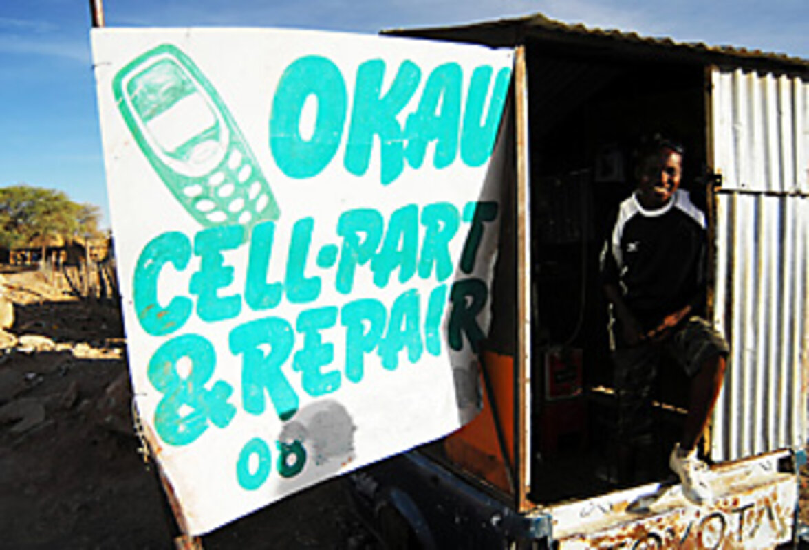 聽This has sparked a new sort of business in both rural areas and city townships: the independent cellphone repair shop. Mr. Nendongo's shop in Opuwo, for instance, is one of five owned by a local businessman. And his company is only one of many. "We have too much competition these days," he sighs.