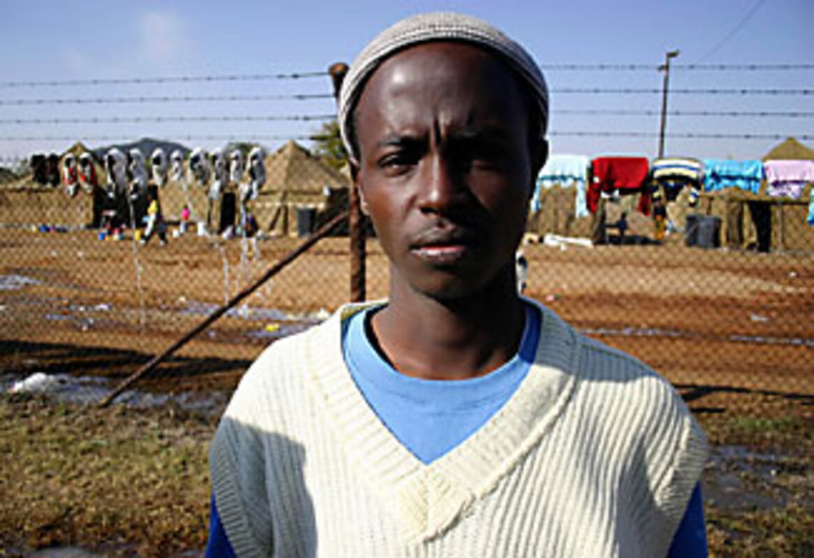 Yitbarak, a young Somali whose shop in a Johannesburg township was burned by angry mobs 23 days ago, says that conditions in the camp are abysmal, that it's not safe to leave. "The government says they are going to protect us, but it is the police who are attacking us," he says. "The police tell us, 'Go home, this is not your country. This is South Africa.' "