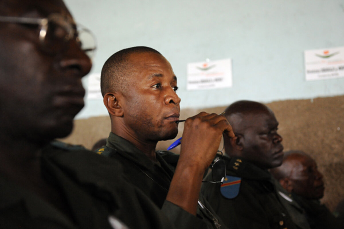 "We have a crisis of leadership [in Congo]," says Mr. Walupakah in an interview after the training session, adding that it's rare to see military and police officers speak to a crowd and be held accountable. "If men are not involved [in preventing rape], it will not change.