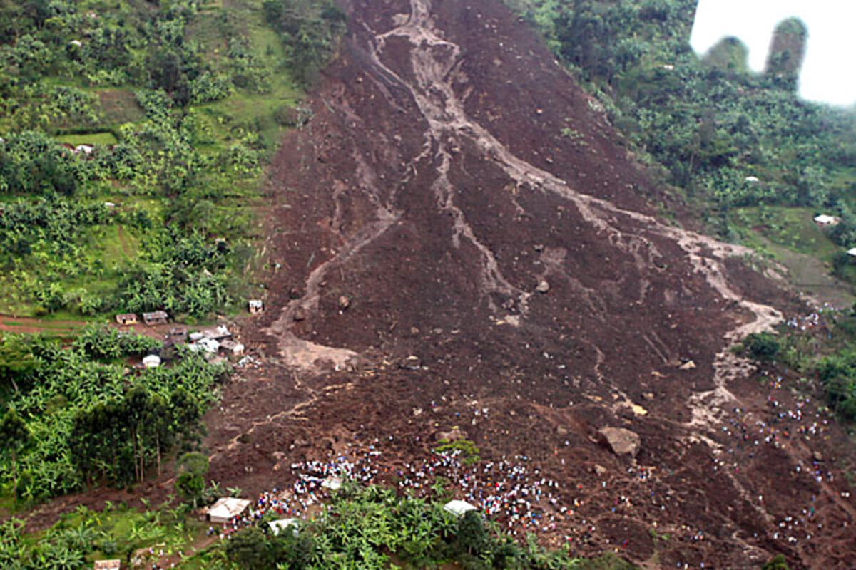 Two days after the catastrophe, emergency rescue teams from the Ugandan Army, local volunteers, and the Red Cross slowly worked their way through the piles of earth left in the mudslide's wake. A two-hour walk along slippery mountain paths from the nearest passable road, the town cannot be reached by heavy digging machinery.