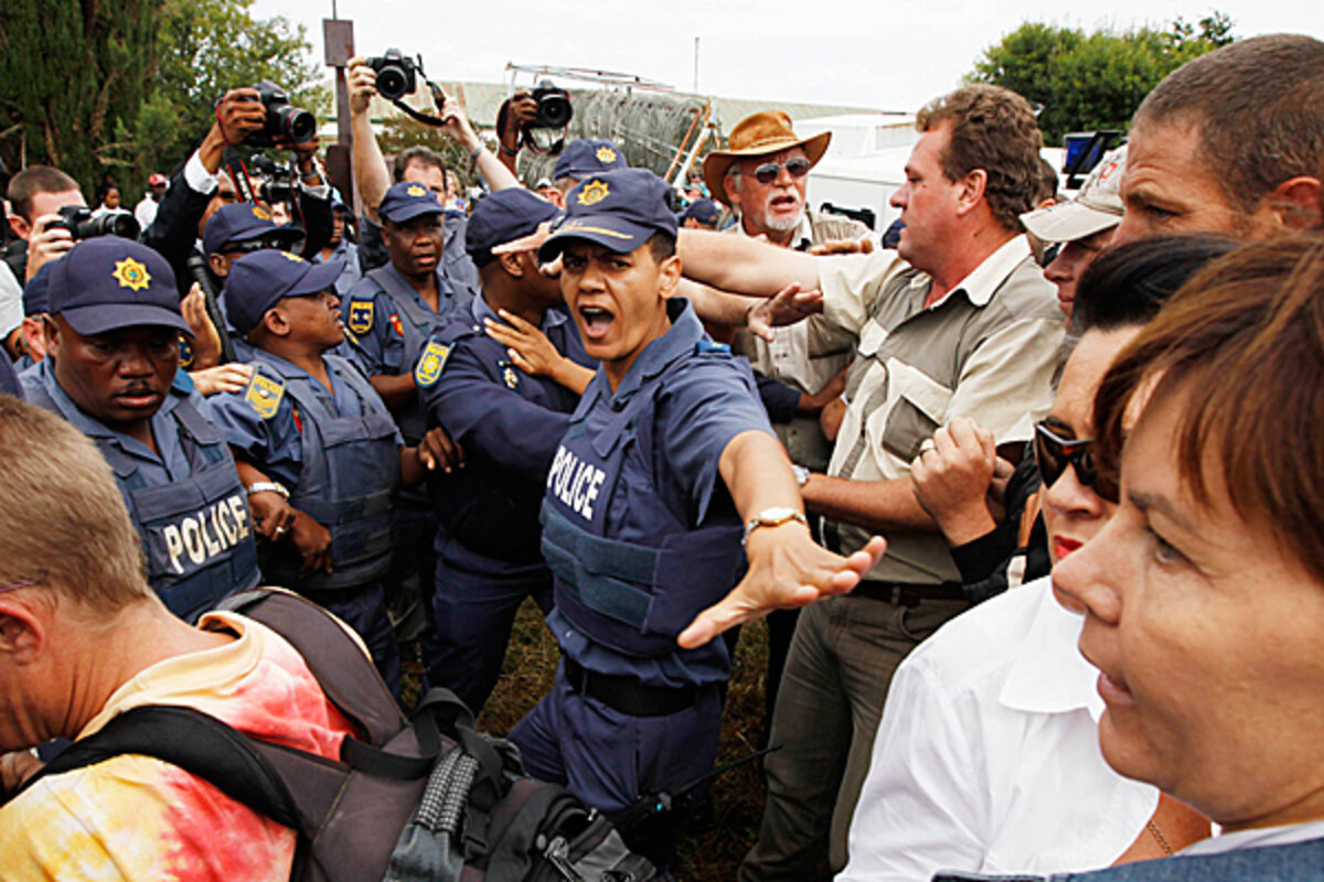 White and black protesters faced each other across barbed wire and police lines as two men appeared in court Tuesday accused of killing far-right white supremacist leader Eugene Terreblanche.