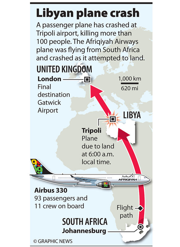 A Libyan-operated Airbus 330-200 carrying 104 people from Johannesburg crashed on arrival at Tripoli鈥檚 airport this morning in what were described as foggy conditions.