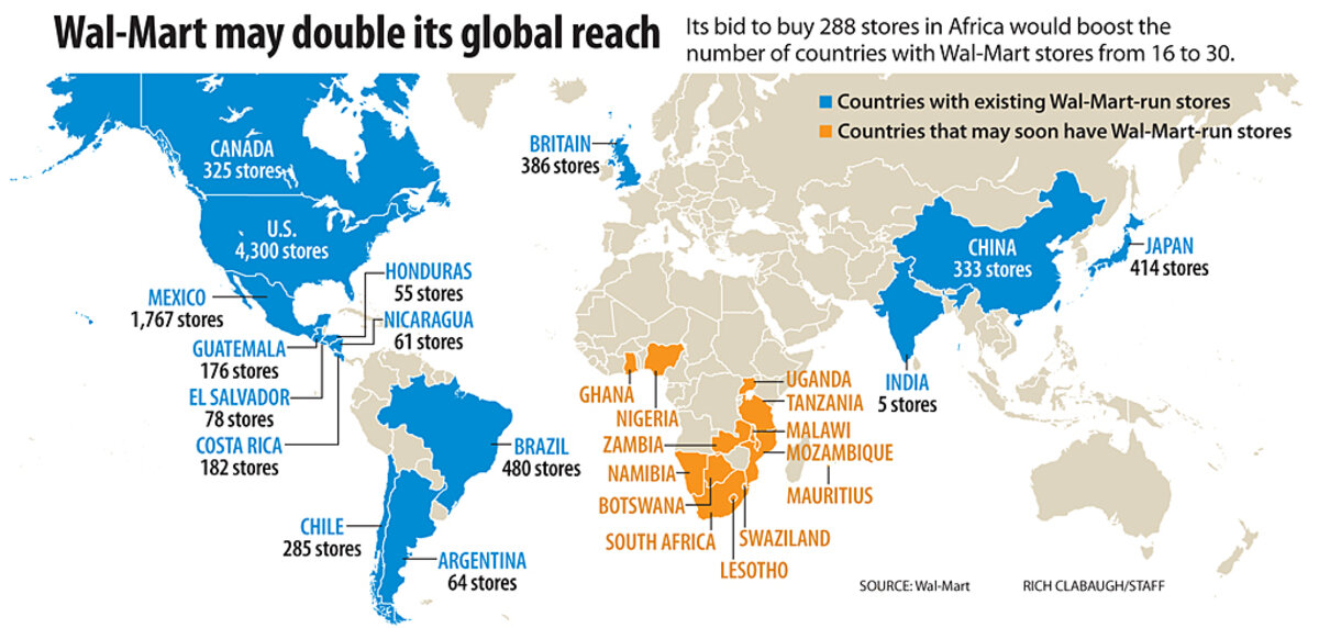 Wal-Mart's $2.37 billion move to acquire South African retailer Massmart is surpassed only by its $11 billion takeover of British retailer Asda in 1999. It would add 288 stores and 14 more countries to its revenue-churning arsenal.