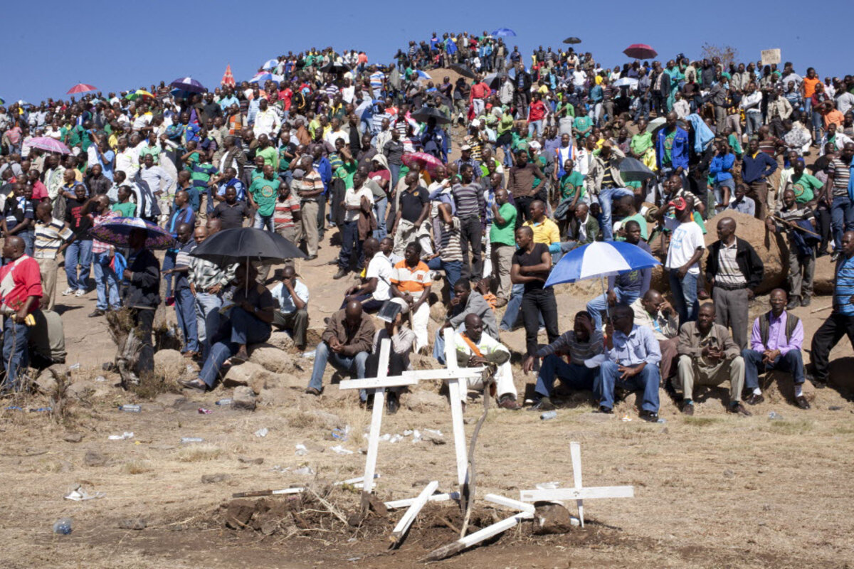 They sang songs, were led in prayer by church leaders, and listened to speeches analyzing the events of Aug. 16, 2012, when armed police opened fire on a crowd that was refusing to disperse from where it had gathered on a hill near the platinum-digging operation.
