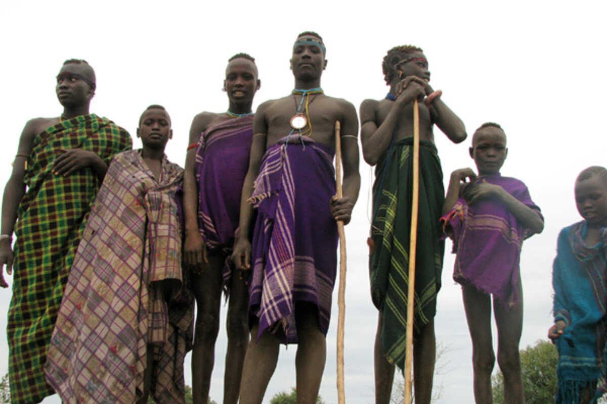The Mursi have lived in Omo for centuries. Partly for this reason they get frequent visits by tourists and anthropologists alike. Tall and elaborately decorated, their scarified bodies are daubed with paint and ornamented by hooped earrings and bicep bangles.