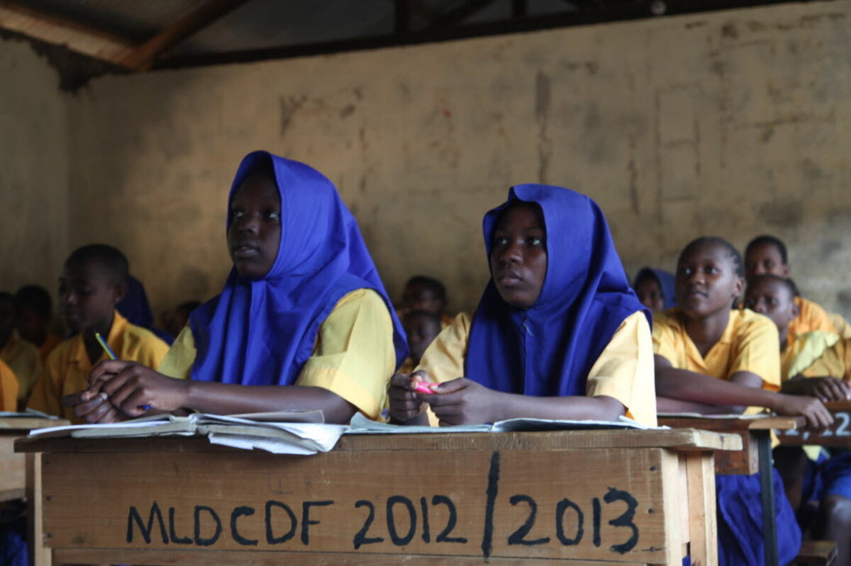On a steamy day on the Kenyan coast, a tall student stands at the courtyard water pump at her school filling a wheelbarrow during a class break. Her arms, bare to above her elbow, poke out from beneath her blue hijab.