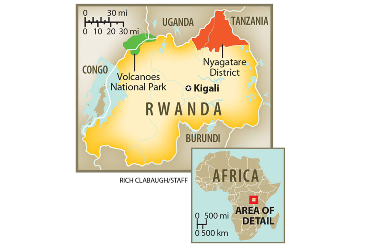 The hills that back up against this village in northeastern Rwanda are blanketed by a tight patchwork of farmland, neat slices of green and brown earth heavy with sweet potatoes, beans, and cassava.