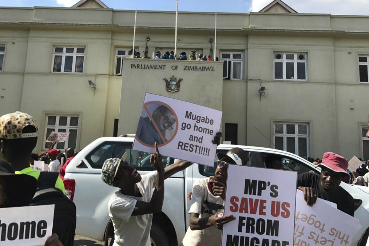 Impeachment proceedings began days after huge crowds surged through the capital, Harare, to demand that Mugabe quit. The ruling party had instructed government ministers to boycott a cabinet meeting that Mugabe called for Tuesday morning at State House, the president's official residence, and instead attend a meeting at party headquarters to work on the impeachment.